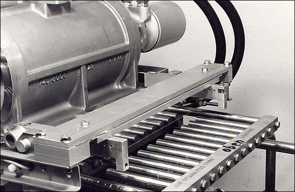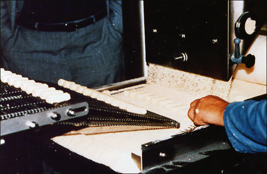 Pump style filling on a horizontal plane, product gently flows into the mould plate void minimising overworking. E.G.: Full muscle product or even soft noodles can be formed without destroying the integrity